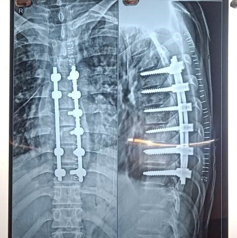 Spinal fixation and decompression surgery including laminectomy, abscess drainage, and biopsy to relieve pressure and control infection.